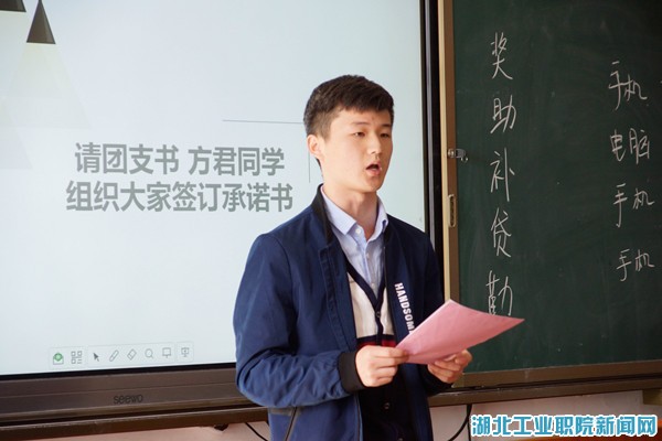 整场班会以现场直播的方式进行。主讲老师曲杉从现场提问和前期校园关于“消费”的调研视频开始,引导学生要树立正确的消费观念,不要盲目攀比,不要超前消费,不要迷恋网络赌博,在源头上杜绝非法校园贷。随后,课程采取线上线下互动的方式,由同学们分享他们所知道的非法校园贷的各种表现形式和案例,引发了在场学生的热烈讨论和场外学生的积极参与。曲杉告诫同学们在防范非法校园贷方面要做到“六要六不要”,同时也提醒大家学院在奖、助、补、贷等方面的政策。在班干部的带领下,全班同学集体签署防范非法校园贷承诺书。