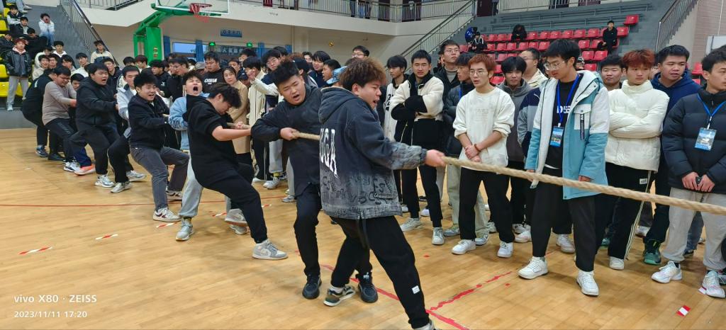 此次趣味运动会共设有7个项目,其中男生以班级为单位参加团体赛“车轮滚滚”、“齐心协力”、“和谐号”、“拔河”项目,女生参加个人赛“摸石头过河”、“踢毽子”、“跳绳”项目。尽管比赛当天室外下着又密又细的冬雨,但却阻挡不了体育馆内同学们的热情。参赛队员们个个精神饱满,奋力拼搏,拉拉队的同学大声呐喊助威,跃跃欲试。