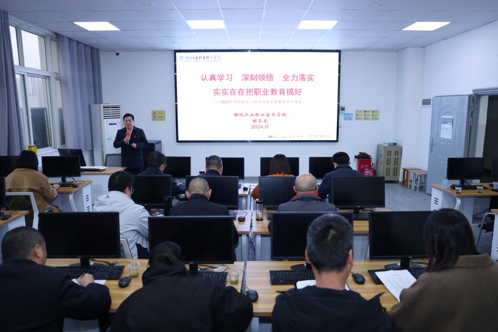 党课中,胡昌龙分享了他在国家教育行政学院高校领导干部进修班的学习收获,梳理了党的二十大、二十届三中全会和全国教育大会有关职业教育的重要精神,领学了习近平总书记关于职业教育的重要论述和教育部关于高职教育的新要求,提出职业院校要在服务国家战略和区域发展中找准办学定位,在服务产业发展中找到办学特色,在助力大国外交中找准国际合作,在夯实内涵建设中找到价值地位,在数字化转型发展中找到新动能,在党建引领发展中找到力量源泉。胡昌龙强调,全体教职工要坚定信心,按照学校既定的办学理念、目标和举措,坚持不懈、实实在在抓落实;要改革创新,围绕国家战略、区域发展和产业需要,结合学校实际,调整优化专业设置,着力强化市域产教联合体、行业产教融合共同体和“五金”建设;要真抓实干,边探索实践边总结宣传边理论研究;要团结奋斗,党建引领、思政铸魂,实现党建与业务深度融合,以高质量党建促进学校事业高质量发展。